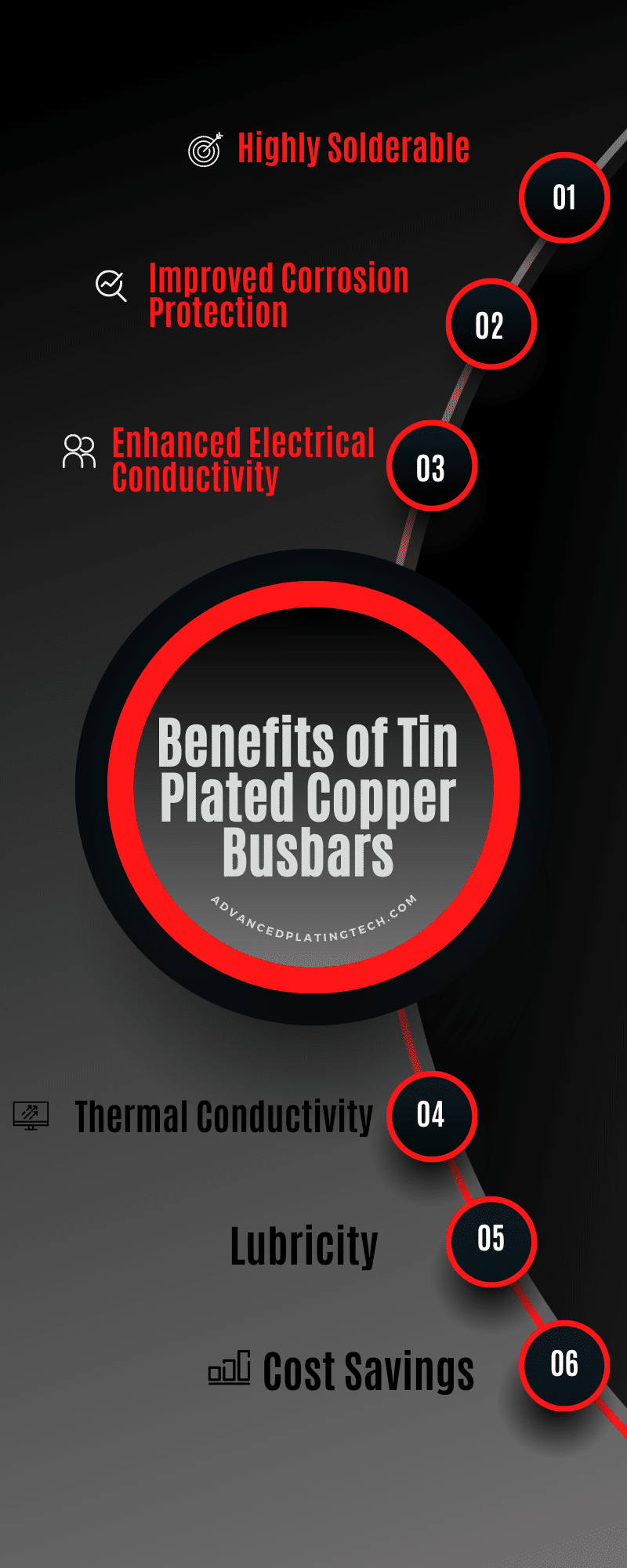 在电子与持续发展,电动汽车,和配电行业,需要一个具有成本效益和导电金属需求增长。镀锡为这些行业提供了许多可取的属性包括改善导电性、润滑性,可焊性、传热和耐蚀性。镀锡铜母线通常用于提供一个具有成本效益的、导电涂层,以确保可靠的电流转移产品的整个生命周期。镀锡是哑光和亮配方,可以与元素如铅合金,提高可焊性和耐化学性。镀锡的底座可以先于铜或镍优化函数,可焊性和长寿的镀巴士,接触或终端。